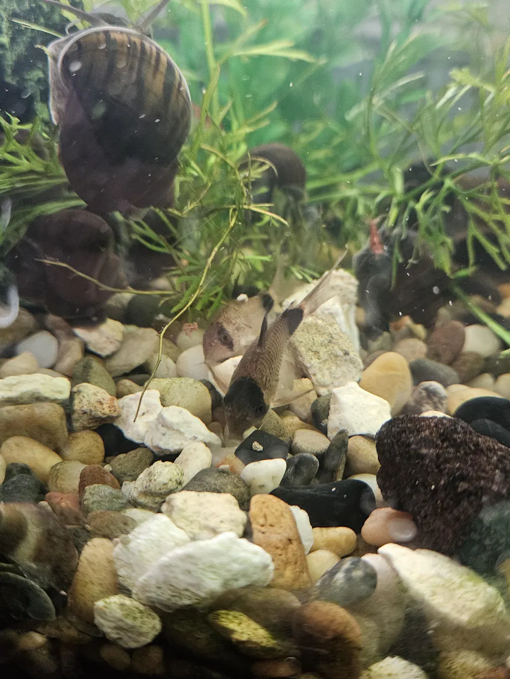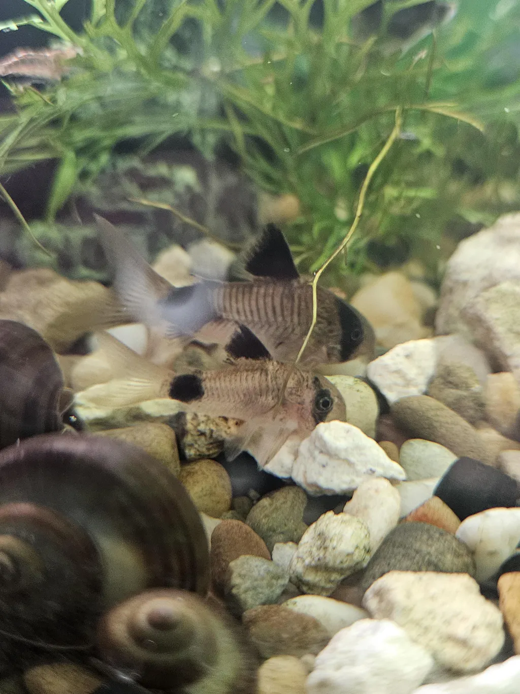Panda Corys are one of our favorite Corydoras species here at Flip! They’re easy to recognize by their bold black markings around their eyes and on their tail, which is how they got the “panda” name from. We usually ship these fish around 1.5 inches and they can grow to about 2.5 inches as adults.