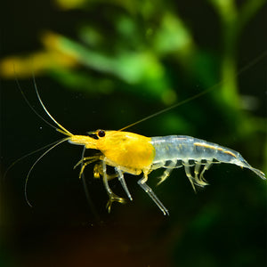 Yellow King Kong Caridina shrimp are stunning dwarf shrimp. They are a mutation from mixing Taiwan Bee shrimp with Tiger shrimp. It is believed that they originated from a Tangerine Tiger and a Blue Bolt or Black King Kong. The Yellow King Kong does breed true or at least in our experience it has.