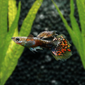 Our USA Bred Dumbo-Eared Red Brown Mosaic Guppy have a great mix of colors. As the pictures show, there is a unique mixture of Reds, White, and Black. Their Dorsals are huge, many times draped over the male's body. These guppies will add beauty and color to any aquarium. They are easy to care for, and they make for the perfect addition to any aquarium.