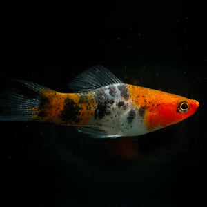 The Sanke Koi Swordtail stands out with its bold mix of orange, white, and black patches that resemble classic Koi coloration. Males have the signature long “sword” tail, while females are rounder in shape. They grow to about 4–6 inches and often swim near the top of the tank, so we recommend a lid or lowering your water level.