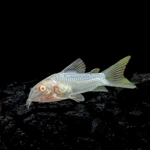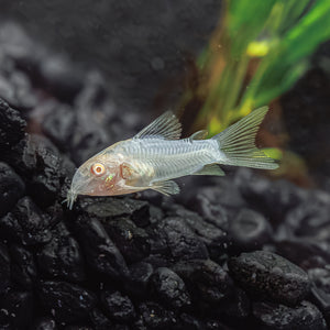 The Albino Cory is a popular corydoras species known for its pale, almost translucent body and bright red eyes. This hardy catfish spends most of its time on the tank bottom, using its whisker-like barbels to sift through sand or fine gravel in search of food. Its scavenging nature makes it a great cleanup crew member, helping to keep leftover pellets and detritus from building up.