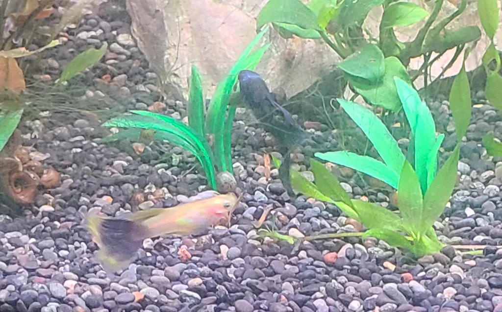 Arrived here looking great and the young male's tail fin has continued to grow larger than the picture in his new home. The darker Dumbo fins show off well against his golden body. If you are looking for a different unique guppy, I recommend the pingu and Flip! He is also a little more chill and easy going than some other male guppies.