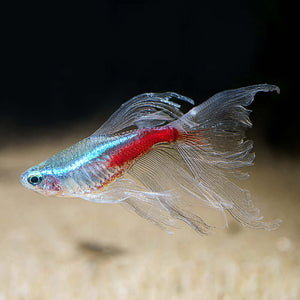 The Long Fin Neon Tetra (Paracheirodon innesi longfin), a breathtaking variant of the classic neon tetra. With elongated fins gracefully trailing behind its slender body adorned with vibrant blue and red stripes, this fish adds elegance and allure to any aquarium. Known for their peaceful demeanor and easy care requirements, they thrive in groups, creating a mesmerizing display as they glide through well-maintained tanks with ample vegetation. Whether you're a beginner or experienced aquarist, these tetras promise to bring tranquility and beauty to your aquatic landscape.