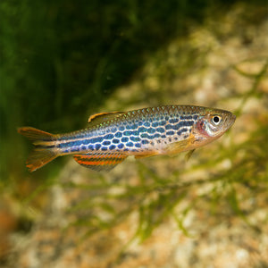 Orange‑finned Danios, Danio kyathitare small and active fish with bright yellow/orange fins with patterns along their sides. They grow to about 1.5–2 inches and love to swim in schools. These playful fish need a secure lid since they may jump and do best in a tank with open swimming space and lots of room to explore.