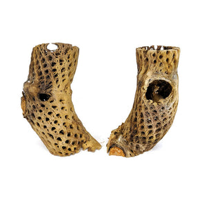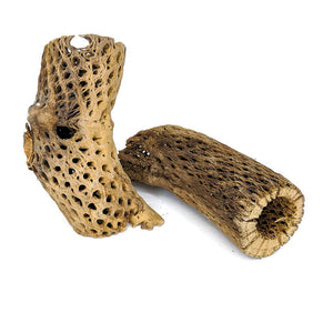 Cholla wood is the skeleton of a cholla plant after it dies. The cholla wood is made up of a ton of holes and is hollow through the center which provides a natural cover for shrimp to hide. A big benefit of cholla wood is the fact that it grows biofilm which is a main food source for shrimp. It also releases tannins into the water, similarly to Indian Almond leaves and other natural products. Cholla wood is a softwood and will eventually break down in the aquarium. This can take many months and up to 2 years depending on size and thickness.